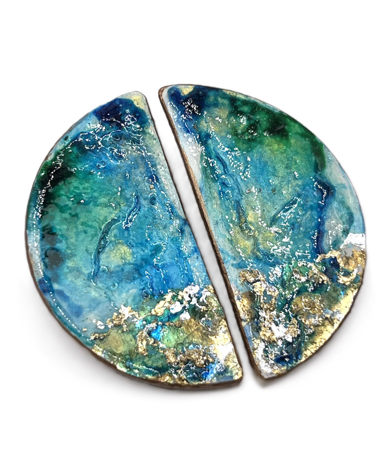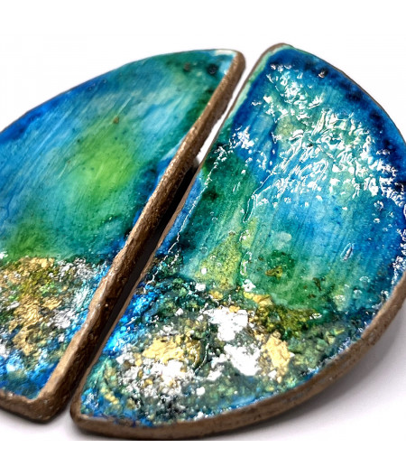 Cercei geometrici, pictați în design abstract și decorați cu foiță de aur/argint. Cerceii sunt realizați integral manual, fiecare piesă fiind diferită, unică prin textură și culoare. Cerceii sunt extrem de ușori, având o greutate contrastantă cu dimensiunea lor, fiind nu doar fascinanți, ci și confortabili și ușor de purtat pe parcursul întregii zile.